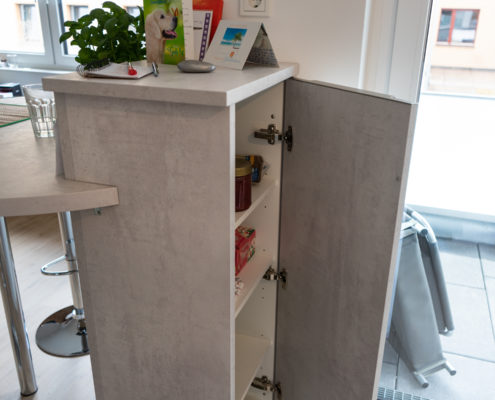 Ich hatte schon vorher die Idee, dass man den offenen Raum irgendwie abtrennt. Da war erst ein normaler Tresen im Gespräch. Der wäre dann an die andere Wand gekommen. Aber das hat mit dem amerikanischen Kühlschrank nicht funktioniert, da bei dem die Türen ja so weit aufgehen. Und dann kam eben die Idee auf, einen hohen, runden Tisch mit einem zusätzlichen Schrank als Trennelement zu kombinieren.