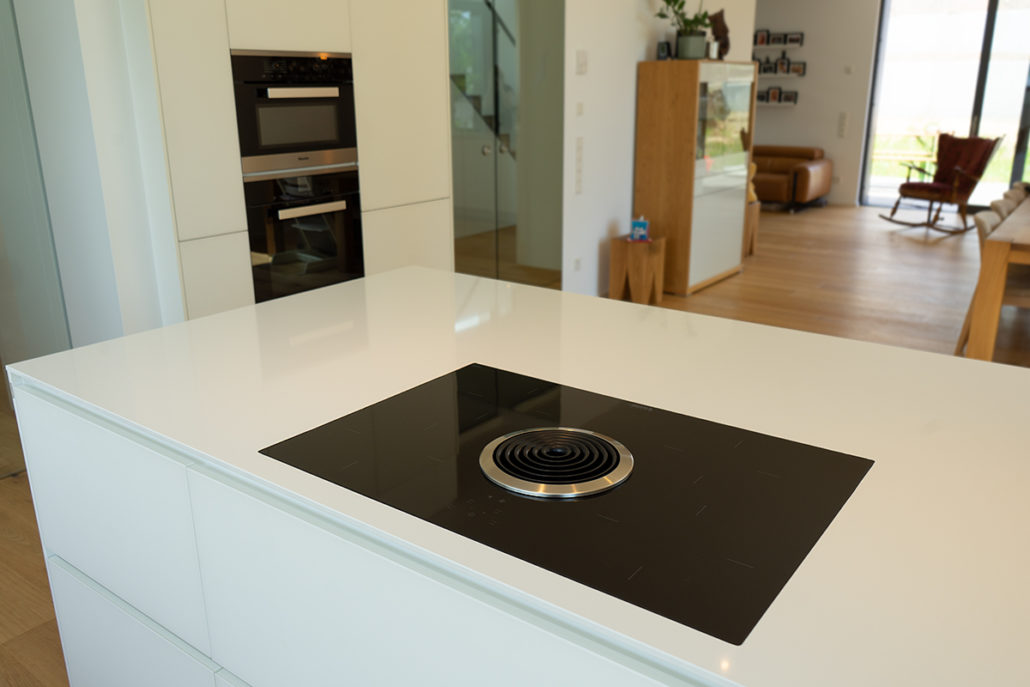„Wir alle – auch Freunde und Familie – sind begeistert vom schlichten Design, wie gut sich alles in den Wohnraum einfügt und dabei gar nicht wie eine Küche wirkt“, schwärmt Frau Kaindl. „Gerade auch dieser ins Kochfeld integrierte Bora Dunstabzug ist etwas, woran ich mich immer wieder freue: Da hängt nichts von der Decke, woran man sich den Kopf stößt oder was die Sicht auf den Wohnraum versperrt. Außerdem sind die Glasfronten, für die wir uns entschieden haben, unheimlich pflegeleicht.“ Das 3 mm starke Sicherheitsglas ist stabil und langlebig.
